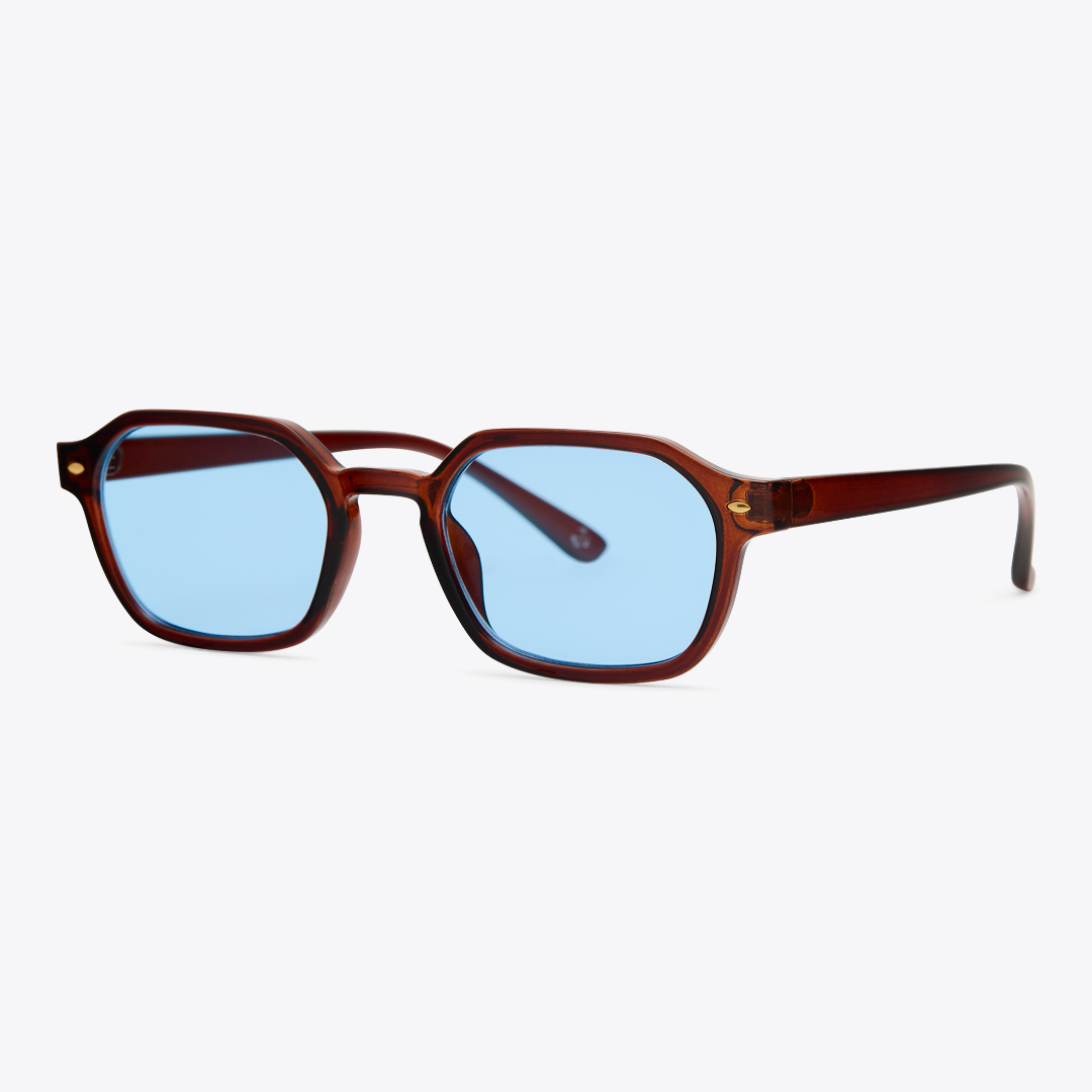 Retro and effortlessly cool, these translucent brown square sunglasses with blue lenses bring vintage charm with a modern twist.